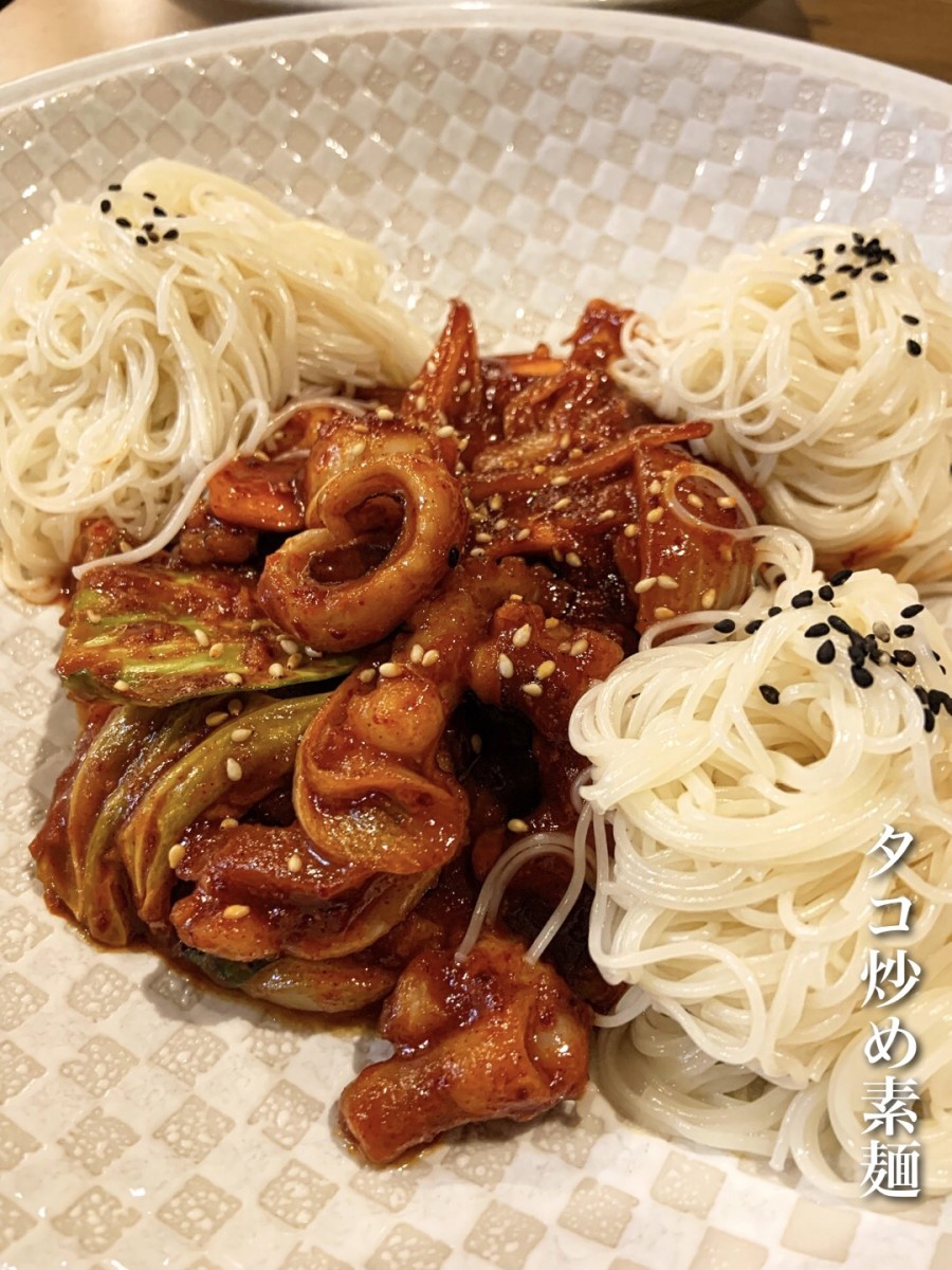 プリプリのタコを甘辛ヤンニョムに炒めたおつまみ料理!何か辛いものが食べたいという方におすすめ!素麺を混ぜて食べるからご飯代わりにもなって満足する一品