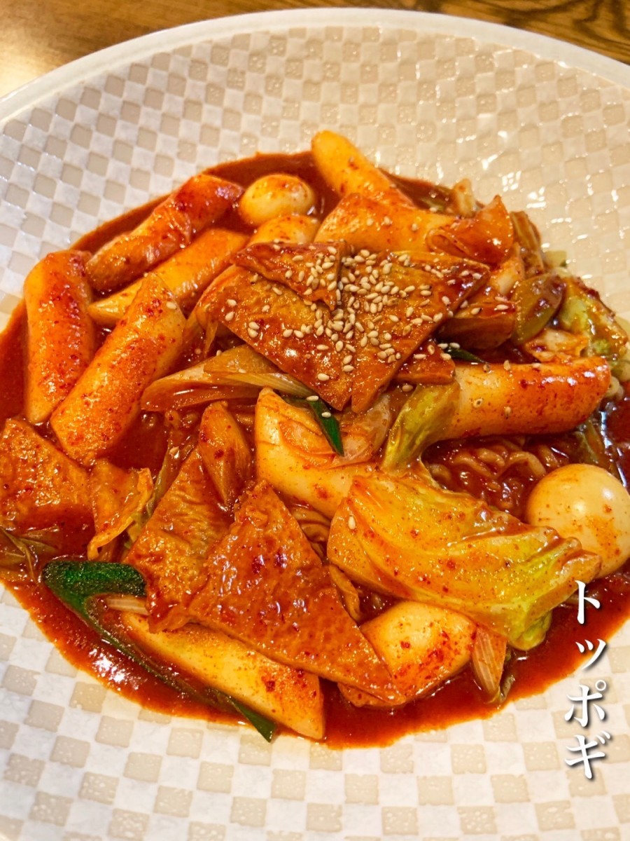 弾力のある餅が甘辛ヤンニョムと絡まってやみつきになるトッポギ!うずらの卵が辛さをマイルドにしてくれてクセになる!お好みでチーズやラメンを入れて食べるのもおすす!