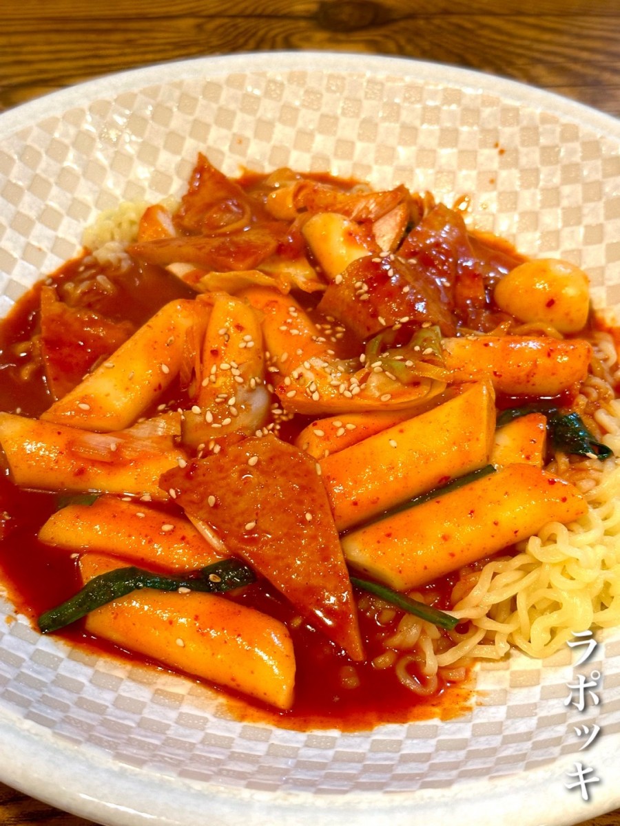 トッポギにラーメンを追加して食べるラッポギ!ラーメンがトッポギソースに絡まってやみつきになります!お好みでチーズをトッピングしたり、スンデやキンパをディップして食べるのもおすすめ!