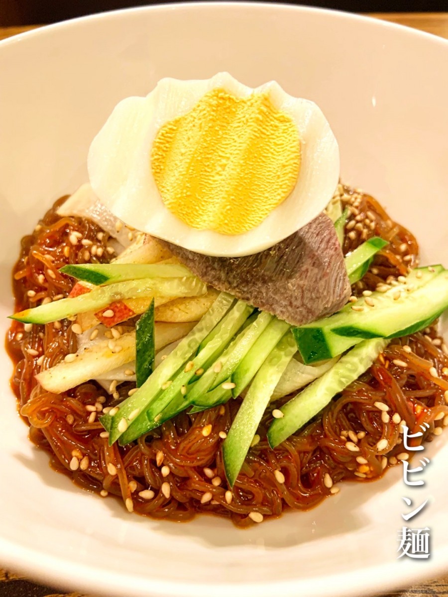 コチュジャンベースに味付けした辛い冷麺!スープがないのが特徴です!甘辛く、酸味が少しあって口当たりが良いため、暑くて食欲がない日に丁度いい一品です