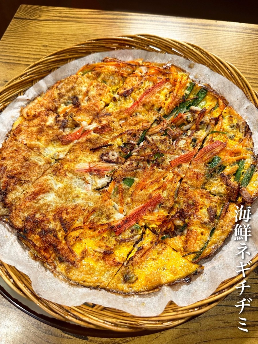 当店人気No.1のチヂミ!日本で1番おいしいチヂミを作ってます!具沢山で粉っぽくないから何枚食べてもおいしいです!食べやすくカットしてあるから大人数でもシェアしやすいからおすすめ!
